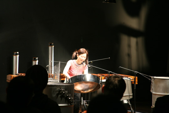数十本のスチールドラムと様々な打楽器が整然と並ぶステージは、さながらライトアップされた工場の夜景をみるようだ。スプリング、鉄管、ピアノ線、スチールロッドなど様々な加工を施したスチールドラムに加藤訓子の音楽的センスが新たな命を吹き込む。そのスチールドラムが奏でるサウンドは、繊細で、時に激しく我々の胸に響く。